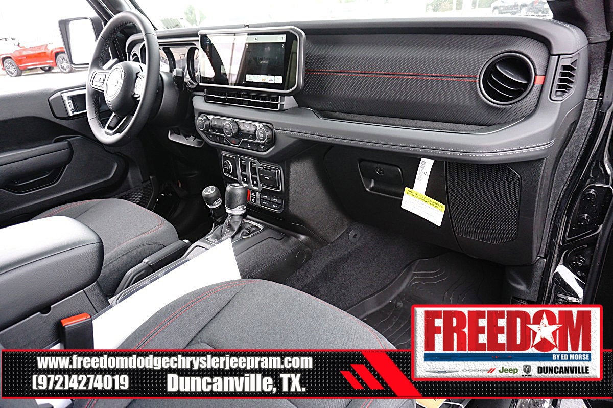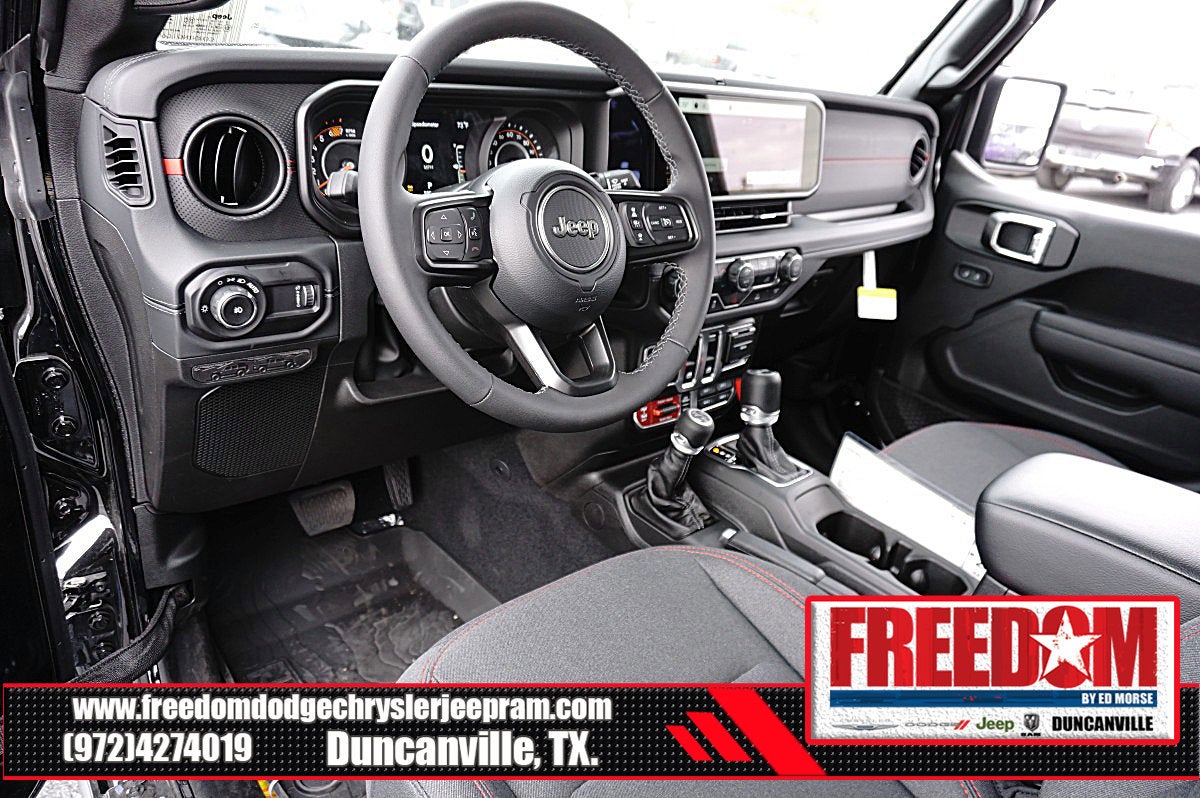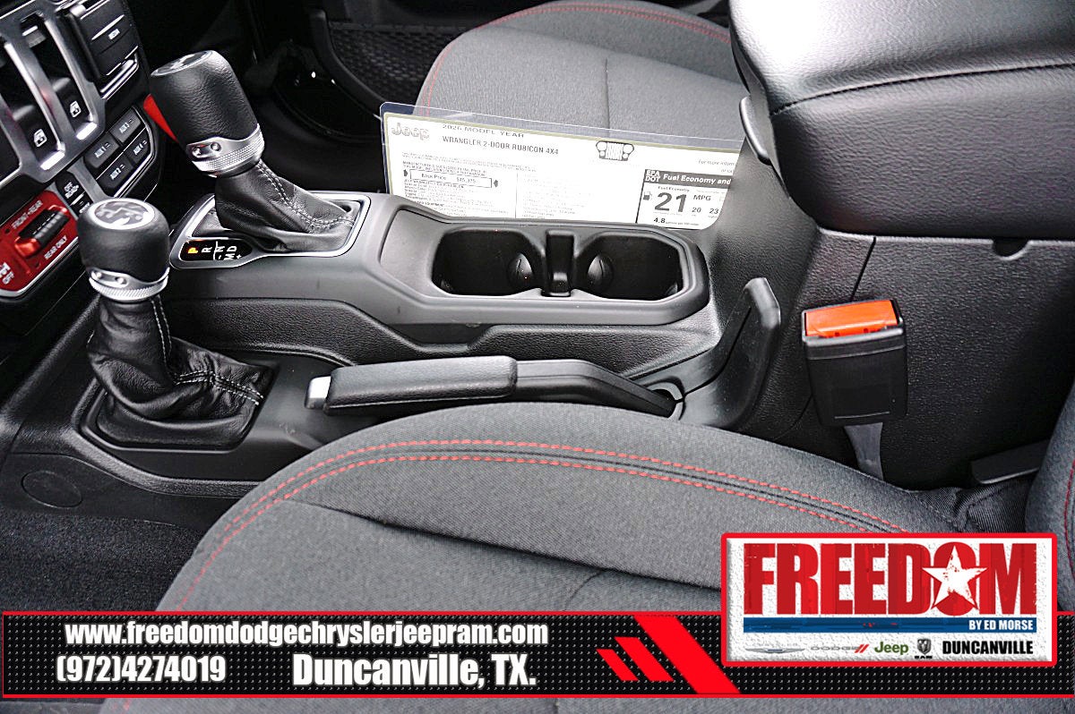 Big cash and no payments for 90 days! Our only Dealership add is GREAT CUSTOMER SERVICE. Real Deals, No Games and No Surprises. Price Includes only Rebates EVERYONE Qualifies for. We Make it Easy No Games. Equipped with Quick Order Package 22R Rubicon, 12.3 Touchscreen Display, 4-Wheel Disc Brakes, 4.10 Rear Axle Ratio, 4G LTE Wi-Fi Hot Spot, 8 Speakers, ABS brakes, Air Conditioning, Alloy wheels, AM/FM radio: SiriusXM with 360L, Apple CarPlay, Apple CarPlay/Android Auto, Automatic temperature control, Aux Battery, Auxiliary Switches, Black 3-Piece Hard Top, Brake assist, Class II Receiver Hitch, Cloth Low-Back Bucket Seats, Compass, Connectivity - US/Canada, Delay-off headlights, Driver door bin, Driver vanity mirror, Dual front impact airbags, Dual front side impact airbags, Electronic Stability Control, Emergency communication system: Jeep Connect, For More Info, Call 800-643-2112, Freedom Panel Storage Bag, Front anti-roll bar, Front Bucket Seats, Front Center Armrest w/Storage, Front dual zone A/C, Front fog lights, Front License Plate Bracket, Front reading lights, Fully automatic headlights, Google Android Auto, Heated door mirrors, Illuminated entry, Integrated Center Stack Radio, Integrated roll-over protection, Low tire pressure warning, MOPAR All-Weather Floor Mats, No Soft Top, Non-Lock Fuel Cap Without Discriminator, Occupant sensing airbag, Outside temperature display, Overhead airbag, Panic alarm, ParkView Rear Back-Up Camera, Passenger door bin, Passenger vanity mirror, Performance Suspension, Power door mirrors, Power steering, Power windows, Radio data system, Radio: Uconnect 5 with 12.3 Display, Rear anti-roll bar, Rear reading lights, Rear Window Defroster, Rear Window Wiper/Washer, Remote keyless entry, Security system, SiriusXM Radio Service, SiriusXM with 360L, Speed control, Steering wheel mounted audio controls, Stop-Start Dual Battery System, Tachometer, Telescoping steering wheel, Tilt steering wheel, Traction control, Trip computer, Variably intermittent wipers, Voltmeter, and Wheels: 17 x 7.5 Machined/Painted Black Freedom uses very reasonable effort to ensure the accuracy of information, we are not responsible for any errors or omissions contained on these pages. Please verify any information in question with Freedom Chrysler Dodge Jeep Ram * Images, prices, and options shown, including vehicle color, trim, options, pricing and other specifications are subject to availability, incentive offerings, current pricing and credit worthiness. * MSRP is the Manufacturer's Suggested Retail Price (MSRP) of the vehicle. It does not include any taxes, fees or other charges. Pricing and availability may vary based on a variety of factors, including options, dealer, specials, fees, and financing qualifications. Consult your dealer for actual price and complete details. Vehicles shown may have optional equipment at an additional cost. * The estimated selling price that appears after calculating dealer offers is for informational purposes, only. You may not qualify for the offers, incentives, discounts, or financing. Not all rebates are compatible with each other. Offers, incentives, discounts, or financing are subject to expiration and other restrictions. See dealer for qualifications and complete details. * In transit means that vehicles have been built but have not yet arrived at your dealer. Images shown may not necessarily represent identical vehicles in transit to the dealership. See dealer for actual price, payments and complete details. EPA Estimates are only estimating. Tax, title, license (unless itemized above) are extra. Not available with special finance, lease and some other offers. Price includes: $1000 - 2026 National Stellantis Loyalty Bonus Cash . Exp. 03/31/2026 $500 - 2026 National 2026 Military Bonus Cash . Exp. 01/04/2027