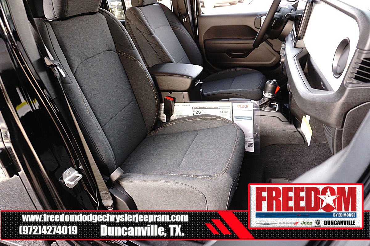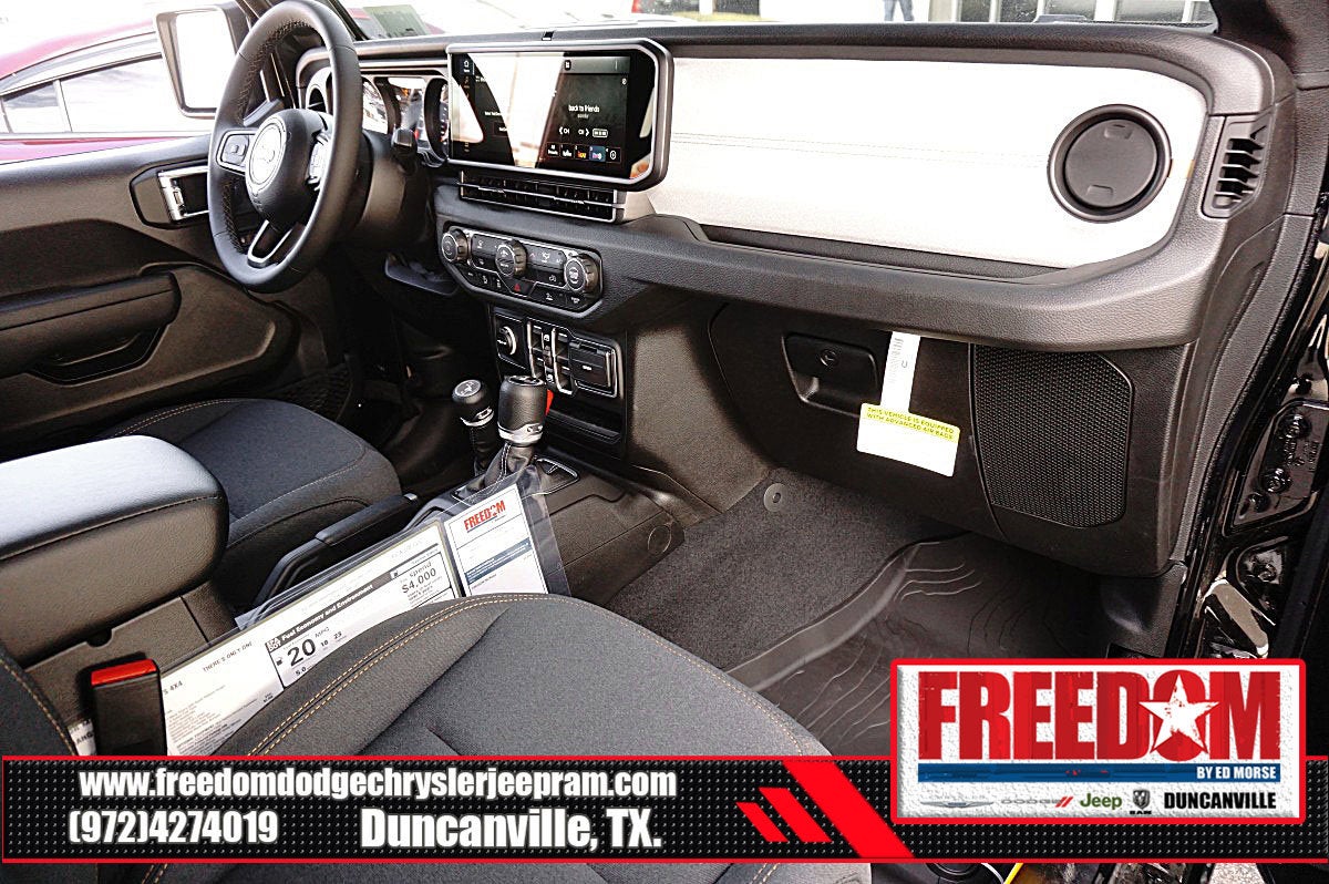 Big cash and no payments for 90 days! Our only Dealership add is GREAT CUSTOMER SERVICE. Real Deals, No Games and No Surprises. Price Includes only Rebates EVERYONE Qualifies for. We Make it Easy No Games. Equipped with Quick Order Package 24S Sport S (Advanced Brake Assist, Automatic Headlamps, Corning Gorilla Glass, Deep Tint Sunscreen Windows, Enhanced Adaptive Cruise Control, Full Speed Forward Collision Warning Plus, Power Heated Mirrors, Premium Wrapped Steering Wheel, Security Alarm, Sun Visors with Illuminated Vanity Mirrors, and Wheels: 17 x 7.5 Gray), 12.3 Touchscreen Display, 3.45 Overall Top Gear Ratio, 4-Wheel Disc Brakes, 4G LTE Wi-Fi Hot Spot, 8 Speakers, ABS brakes, Air Conditioning, AM/FM radio: SiriusXM with 360L, Apple CarPlay, Apple CarPlay/Android Auto, Aux Battery, Black 3-Piece Hard Top, Brake assist, Compass, Connectivity - US/Canada, Delay-off headlights, Driver door bin, Driver vanity mirror, Dual front impact airbags, Dual front side impact airbags, Electronic Stability Control, For More Info, Call 800-643-2112, Freedom Panel Storage Bag, Front anti-roll bar, Front Bucket Seats, Front Center Armrest w/Storage, Front fog lights, Front reading lights, Google Android Auto, Illuminated entry, Integrated Center Stack Radio, Integrated roll-over protection, Low tire pressure warning, MOPAR All-Weather Floor Mats, No Soft Top, Non-Lock Fuel Cap Without Discriminator, Normal Duty Suspension, Occupant sensing airbag, Outside temperature display, Overhead airbag, Panic alarm, ParkView Rear Back-Up Camera, Passenger door bin, Passenger vanity mirror, Power steering, Power windows, Radio data system, Radio: Uconnect 5 with 12.3 Display, Rear anti-roll bar, Rear reading lights, Rear Window Defroster, Rear Window Wiper/Washer, Remote keyless entry, SiriusXM Radio Service, SiriusXM with 360L, Speed control, Split folding rear seat, Steering wheel mounted audio controls, Stop-Start Dual Battery System, Tachometer, Telescoping steering wheel, Tilt steering wheel, Traction control, Trip computer, Variably intermittent wipers, and Wheels: 17 x 7.5 Black Steel Styled Freedom uses very reasonable effort to ensure the accuracy of information, we are not responsible for any errors or omissions contained on these pages. Please verify any information in question with Freedom Chrysler Dodge Jeep Ram * Images, prices, and options shown, including vehicle color, trim, options, pricing and other specifications are subject to availability, incentive offerings, current pricing and credit worthiness. * MSRP is the Manufacturer's Suggested Retail Price (MSRP) of the vehicle. It does not include any taxes, fees or other charges. Pricing and availability may vary based on a variety of factors, including options, dealer, specials, fees, and financing qualifications. Consult your dealer for actual price and complete details. Vehicles shown may have optional equipment at an additional cost. * The estimated selling price that appears after calculating dealer offers is for informational purposes, only. You may not qualify for the offers, incentives, discounts, or financing. Not all rebates are compatible with each other. Offers, incentives, discounts, or financing are subject to expiration and other restrictions. See dealer for qualifications and complete details. * In transit means that vehicles have been built but have not yet arrived at your dealer. Images shown may not necessarily represent identical vehicles in transit to the dealership. See dealer for actual price, payments and complete details. EPA Estimates are only estimating. Tax, title, license (unless itemized above) are extra. Not available with special finance, lease and some other offers. Price includes: $1500 - 2026 National Stellantis Loyalty Retail Bonus Cash . Exp. 02/02/2026 $500 - 2026 Southwest BC Retail Bonus Cash . Exp. 02/02/2026