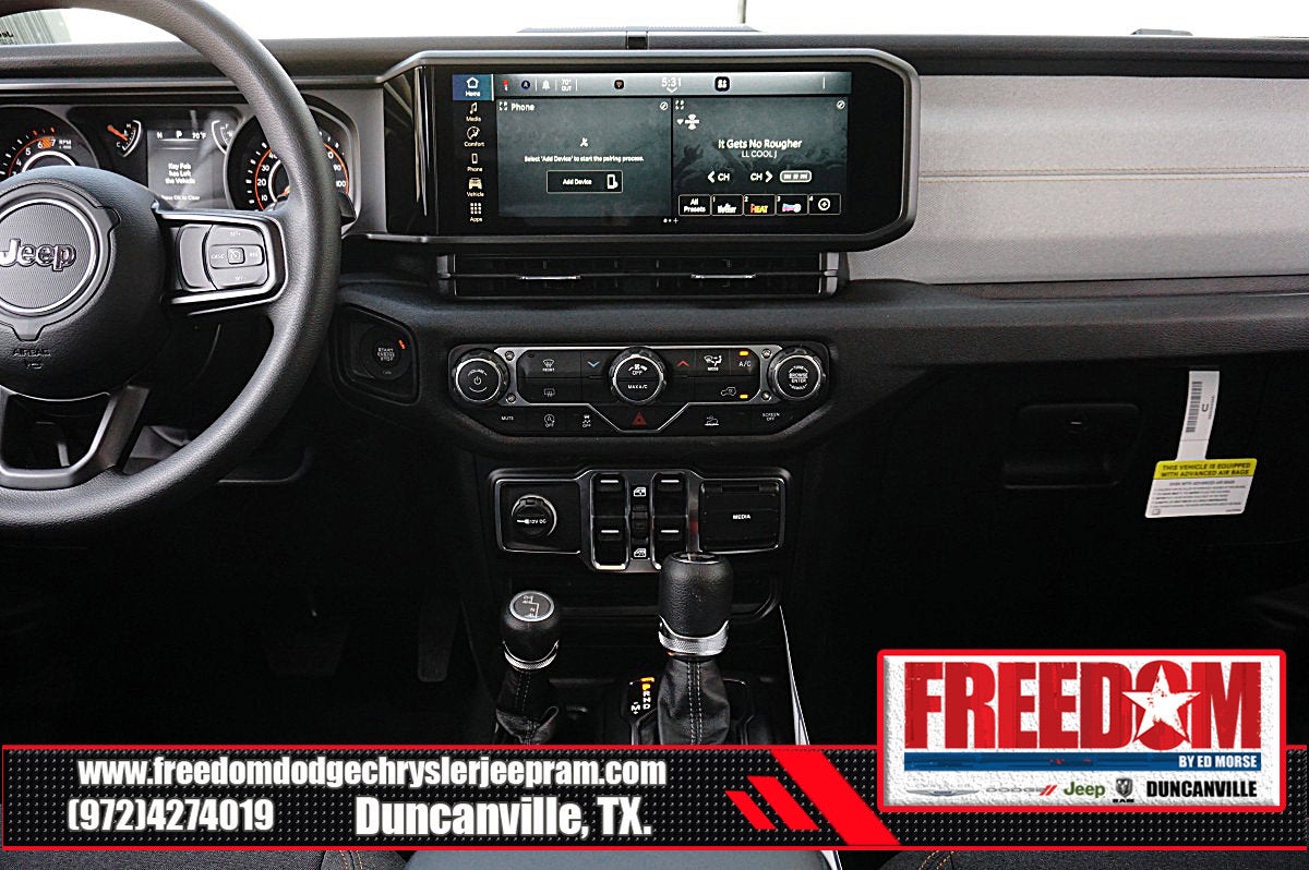 Big cash and no payments for 90 days! Our only Dealership add is GREAT CUSTOMER SERVICE. Real Deals, No Games and No Surprises. Price Includes only Rebates EVERYONE Qualifies for. We Make it Easy No Games. Equipped with Quick Order Package 22B Sport, 12.3 Touchscreen Display, 3.45 Overall Top Gear Ratio, 4-Wheel Disc Brakes, 4G LTE Wi-Fi Hot Spot, 8 Speakers, ABS brakes, Air Conditioning, AM/FM radio: SiriusXM with 360L, Apple CarPlay, Apple CarPlay/Android Auto, Aux Battery, Black 3-Piece Hard Top, Brake assist, Compass, Connectivity - US/Canada, Delay-off headlights, Driver door bin, Driver vanity mirror, Dual front impact airbags, Dual front side impact airbags, Electronic Stability Control, For More Info, Call 800-643-2112, Freedom Panel Storage Bag, Front anti-roll bar, Front Bucket Seats, Front Center Armrest w/Storage, Front fog lights, Front reading lights, Google Android Auto, Illuminated entry, Integrated Center Stack Radio, Integrated roll-over protection, Low tire pressure warning, Manufacture Statement of Origin, MOPAR All-Weather Floor Mats, No Soft Top, Non-Lock Fuel Cap Without Discriminator, Normal Duty Suspension, Occupant sensing airbag, Outside temperature display, Overhead airbag, Panic alarm, ParkView Rear Back-Up Camera, Passenger door bin, Passenger vanity mirror, Power steering, Power windows, Radio data system, Radio: Uconnect 5 with 12.3 Display, Rear anti-roll bar, Rear reading lights, Rear Window Defroster, Rear Window Wiper/Washer, Remote keyless entry, SiriusXM Radio Service, SiriusXM with 360L, Speed control, Split folding rear seat, Steering wheel mounted audio controls, Stop-Start Dual Battery System, Tachometer, Telescoping steering wheel, Tilt steering wheel, Traction control, Trip computer, Variably intermittent wipers, and Wheels: 17 x 7.5 Black Steel Styled Freedom uses very reasonable effort to ensure the accuracy of information, we are not responsible for any errors or omissions contained on these pages. Please verify any information in question with Freedom Chrysler Dodge Jeep Ram * Images, prices, and options shown, including vehicle color, trim, options, pricing and other specifications are subject to availability, incentive offerings, current pricing and credit worthiness. * MSRP is the Manufacturer's Suggested Retail Price (MSRP) of the vehicle. It does not include any taxes, fees or other charges. Pricing and availability may vary based on a variety of factors, including options, dealer, specials, fees, and financing qualifications. Consult your dealer for actual price and complete details. Vehicles shown may have optional equipment at an additional cost. * The estimated selling price that appears after calculating dealer offers is for informational purposes, only. You may not qualify for the offers, incentives, discounts, or financing. Not all rebates are compatible with each other. Offers, incentives, discounts, or financing are subject to expiration and other restrictions. See dealer for qualifications and complete details. * In transit means that vehicles have been built but have not yet arrived at your dealer. Images shown may not necessarily represent identical vehicles in transit to the dealership. See dealer for actual price, payments and complete details. EPA Estimates are only estimating. Tax, title, license (unless itemized above) are extra. Not available with special finance, lease and some other offers. Price includes: $1500 - 2026 National Stellantis Loyalty Retail Bonus Cash . Exp. 02/02/2026 $500 - 2026 Southwest BC Retail Bonus Cash . Exp. 02/02/2026