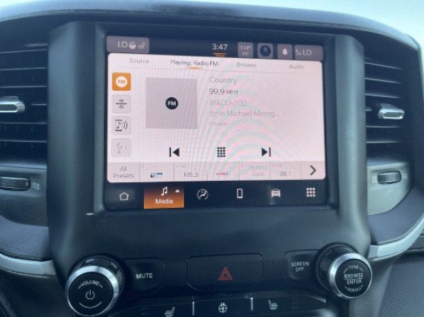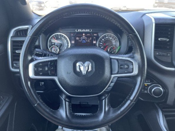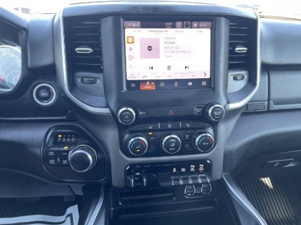 Equipped with Big Horn Level 2 Equipment Group (115V Auxiliary Power Outlet, 115V Auxiliary Rear Power Outlet, 400W Inverter, 4G LTE Wi-Fi Hot Spot, 8.4 Touchscreen Display, Air Conditioning ATC w/Dual Zone Control, Apple CarPlay, Auto-Dimming Exterior Driver Mirror, Auto-Dimming Rear-View Mirror, Black Exterior Mirrors, Black Premium Power Mirrors, Bluetooth® Handsfree Phone & Audio, Class IV Receiver Hitch, Cluster 7.0 TFT Color Display, Connectivity - US/Canada, Convex Wide-Angle Mirror Insert, Exterior Mirrors Courtesy Lamps, Exterior Mirrors w/Heating Element, Exterior Mirrors w/Supplemental Signals, For Details, Visit DriveUconnect.com, For More Info, Call 800-643-2112, Global Telematics Box Module (TBM), Glove Box Lamp, Google Android Auto, GPS Antenna Input, Heated Front Seats, Heated Steering Wheel, Integrated Center Stack Radio, Media Hub w/2 Charge Only USBs, ParkSense Front/Rear Park Assist w/Stop, Power 2-Way Driver Lumbar Adjust, Power 8-Way Driver Seat, Power Adjustable Pedals, Power-Folding Mirrors, Radio: Uconnect 5 W w/8.4 Display, Rear Dome w/On/Off Switch Lamp, Rear Power Sliding Window, Rear Window Defroster, Remote Start System, Security Alarm, SiriusXM Radio Service, SiriusXM Satellite Radio, Sun Visors w/Illuminated Vanity Mirrors, Universal Garage Door Opener, and USB Host Flip), Night Edition (3 Rear Seat Head Restraints, 4 Way Front Headrests, Accent Color Premium Power Mirrors, Anti-Spin Differential Rear Axle, Black Exterior Truck Badging, Black Headlamp Bezels, Black Interior Accents, Black Painted Exterior Mirrors Caps, Body Color Front Bumper, Body Color Rear Bumper w/Step Pads, Bucket Seats, Delete LED Lamp - Floor Console Bin, Deluxe Cloth Bucket Seats, Dual Exhaust w/Black Tips, Front Seat Back Map Pockets, Full Length Floor Console, Grille Surround 1 Black Texture 2 Black, Manual Adjust 4-Way Front Passenger Seat, Rear 60/40 Folding Seat, and Wheels: 20 x 9.0 Premium Paint/Polished), Quick Order Package 25R Lone Star (Regional) (Lone Star Badge), 1500 Big Horn/Lone Star, 4D Quad Cab, HEMI 5.7L V8 Multi Displacement VVT, 8-Speed Automatic, 4WD, Bright White Clearcoat, Black Cloth, 4-Wheel Disc Brakes, 48V Belt Starter Generator, 6 Speakers, ABS brakes, Air Conditioning, Alloy wheels, AM/FM radio, Brake assist, Bumpers: chrome, Cloth Bench Seat, Compass, Delay-off headlights, Driver door bin, Dual front impact airbags, Dual front side impact airbags, Electronic Stability Control, Emergency communication system: SiriusXM Guardian, Front anti-roll bar, Front Center Armrest w/Storage, Front fog lights, Front License Plate Bracket, Front reading lights, Front wheel independent suspension, Fully automatic headlights, Heated door mirrors, Illuminated entry, Integrated Voice Command w/Bluetooth®, Leather steering wheel, Low tire pressure warning, MOPAR Front & Rear Rubber Floor Mats, Occupant sensing airbag, Outside temperature display, Overhead airbag, Overhead cons