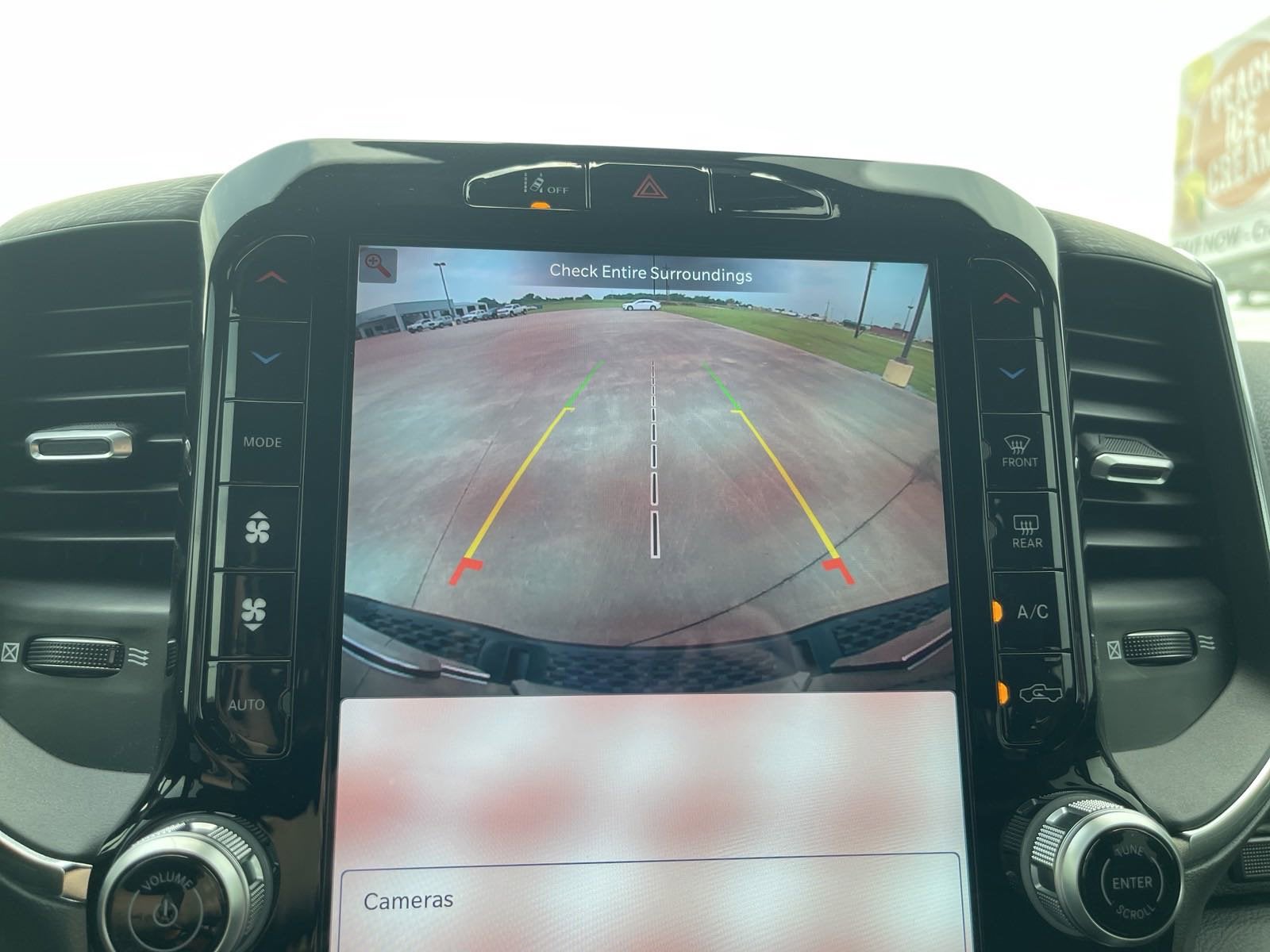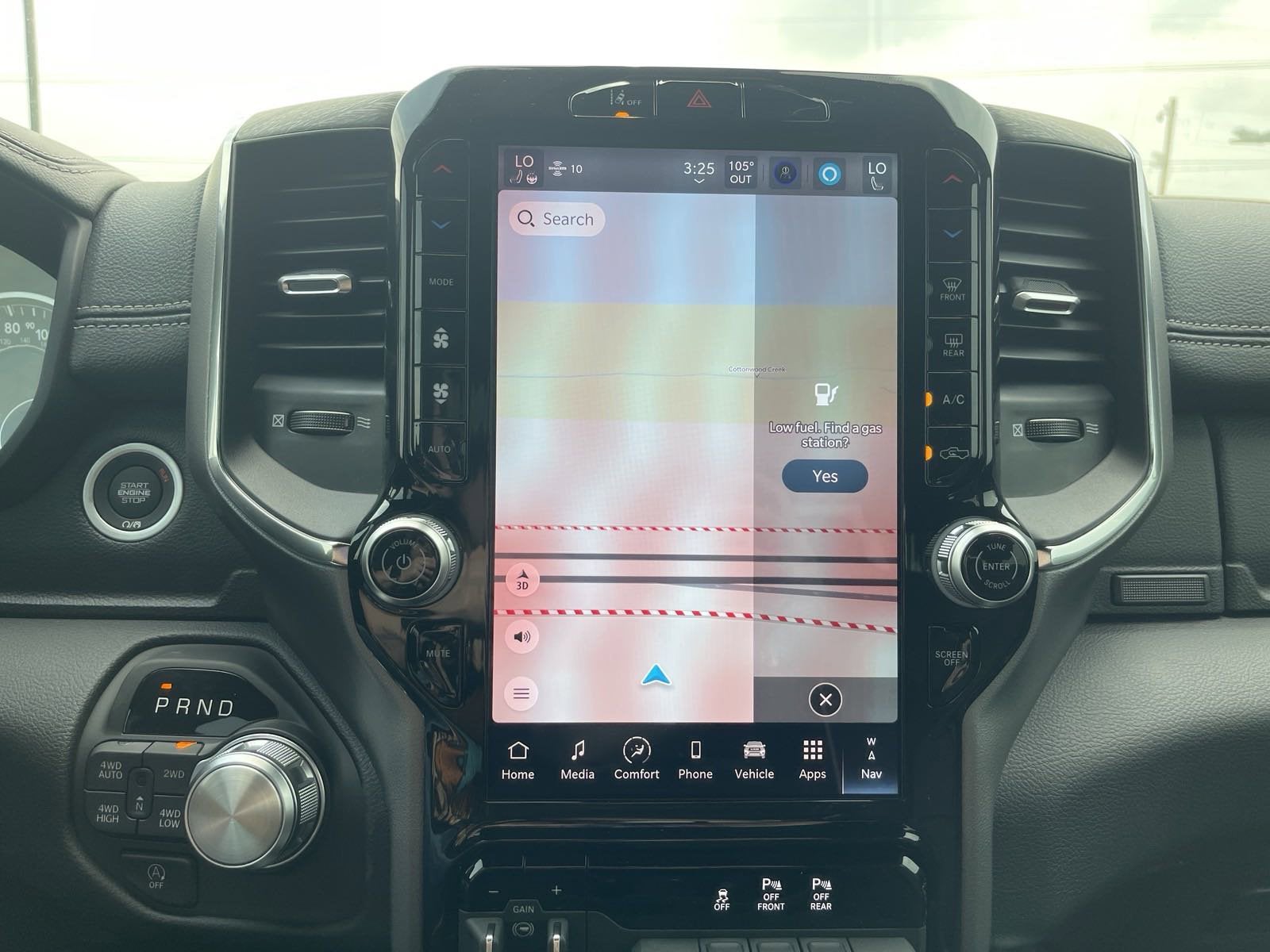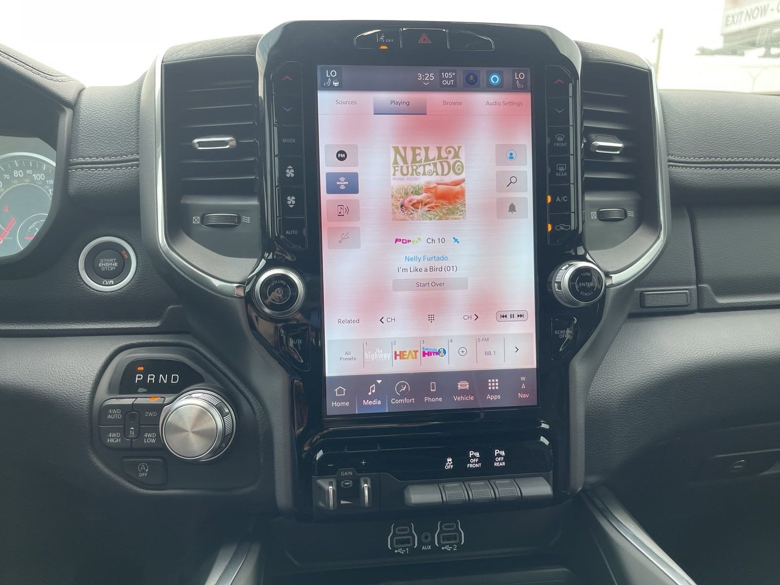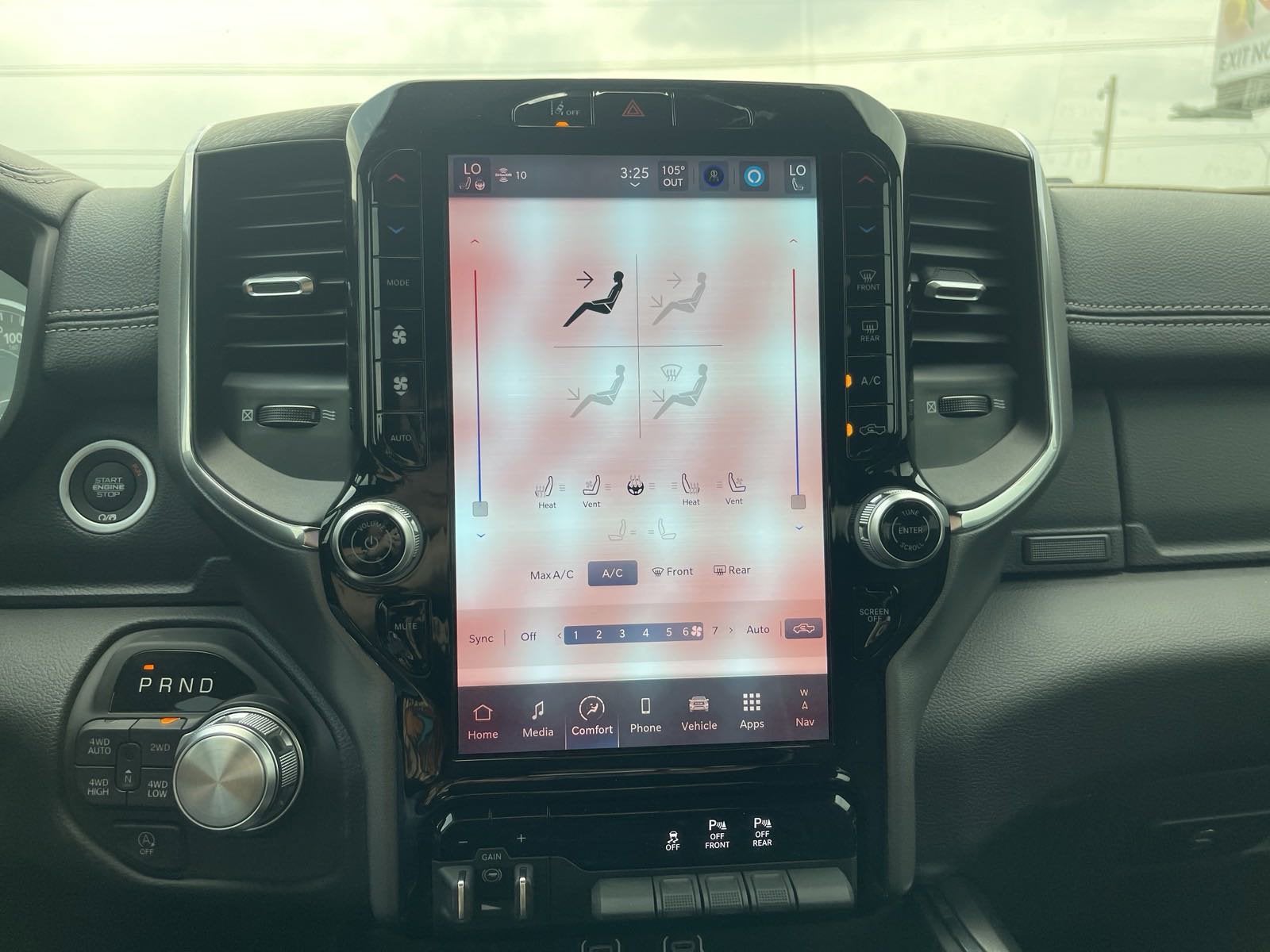 Equipped with Laramie Level 1 Equipment Group (Rain Sensitive Windshield Wipers and Remote Tailgate Release), Laramie Southwest Edition (Accent Color Premium Power Mirrors, Auto Power-Folding Mirrors, Auto-Dimming Exterior Driver Mirror, Black Painted Exterior Mirrors Caps, Body Color Front Bumper, Body Color Rear Bumper w/Step Pads, Convex Wide-Angle Exterior Mirror Insert, Dome Dual LED Reading Lamp, Dual-Pane Panoramic Sunroof, Exterior Mirrors Courtesy Lamps, Exterior Mirrors w/Heating Element, Exterior Mirrors w/Memory, Exterior Mirrors w/Supplemental Signals, Grille Surround 3 Body Color Tex 4 Chrome, LED Dome/Reading Lamp, Power Deployable Running Boards, RAM Grille Badge - Chrome, Tow Hooks, and Trailer Brake Control), Quick Order Package 21H Laramie, 10 Speakers, 3 Rear Seat Head Restraints, 3.55 Rear Axle Ratio, 4 Way Front Headrests, 4-Wheel Disc Brakes, 4G LTE Wi-Fi Hot Spot, ABS brakes, Air Conditioning, Alloy wheels, AM/FM radio: SiriusXM with 360L, Anti-Spin Differential Rear Axle, Apple CarPlay, Apple CarPlay/Android Auto, Audio memory, Auto High-beam Headlights, Auto-dimming door mirrors, Auto-dimming Rear-View mirror, Automatic temperature control, Brake assist, Bumpers: chrome, Chrome Exterior Mirrors, Compass, Connected Travel & Traffic Services, Connectivity - US/Canada, Delay-off headlights, Driver door bin, Driver Seat Memory, Driver vanity mirror, Dual front impact airbags, Dual front side impact airbags, Electronic Stability Control, Front anti-roll bar, Front Center Armrest w/Storage, Front dual zone A/C, Front fog lights, Front License Plate Bracket, Front reading lights, Front Seat Back Map Pockets, Front wheel independent suspension, Fully automatic headlights, Garage door transmitter, Google Android Auto, GPS Antenna Input, GPS Navigation, HD Radio, Heated door mirrors, Heated Front Seats, Heated front seats, Heated rear seats, Heated Steering Wheel, Heated steering wheel, Illuminated entry, Integrated Voice Command w/Bluetooth®, Leather steering wheel, Leather Trim 40/20/40 Bench Seat, Low tire pressure warning, Manufacturer's Statement of Origin, Memory seat, Navigation System, Occupant sensing airbag, Outside temperature display, Overhead airbag, Overhead console, Panic alarm, ParkView Rear Back-Up Camera, Passenger door bin, Passenger vanity mirror, Power 2-Way Driver Lumbar Adjust, Power 2-Way Passenger Lumbar Adjust, Power Adjust 8-Way Front Passenger Seat, Power door mirrors, Power driver seat, Power passenger seat, Power steering, Power windows, Radio data system, Radio: Uconnect 5 Nav w/12.0 Display, Rear anti-roll bar, Rear reading lights, Rear seat center armrest, Rear step bumper, Remote keyless entry, Security system, SiriusXM w/360L, Speed control, Split folding rear seat, Steering wheel mounted audio controls, Tachometer, Telescoping steering wheel, Tilt steering wheel, Traction control, Trip computer, Turn signal indicator mirrors, USB Host Flip, Variably intermittent wipers, Ventilated Front Seats, Ventilated front seats, Voltmeter, and Wheels: 20 x 9 Premium Paint/Polish.