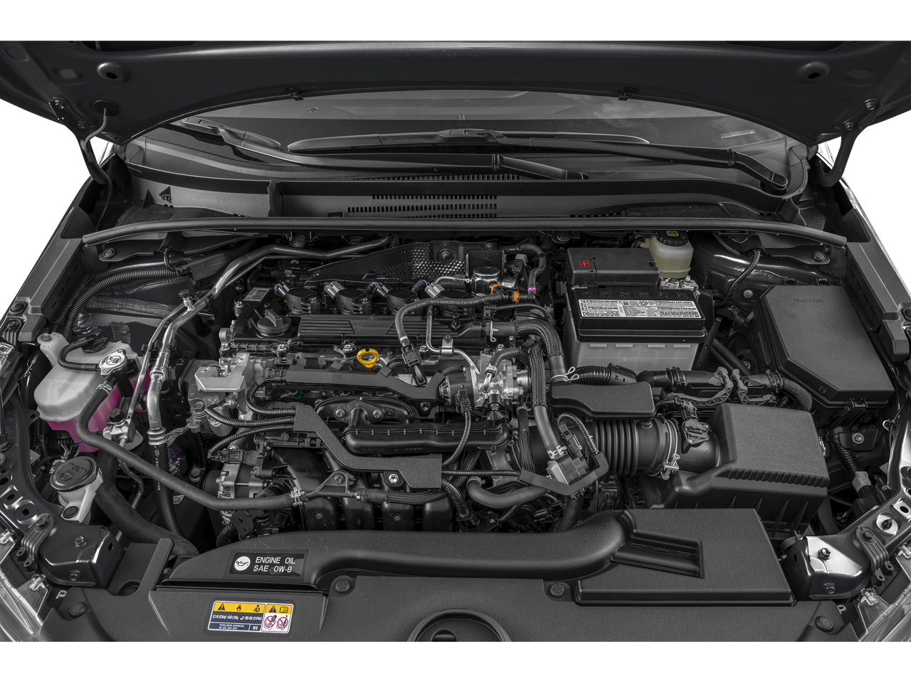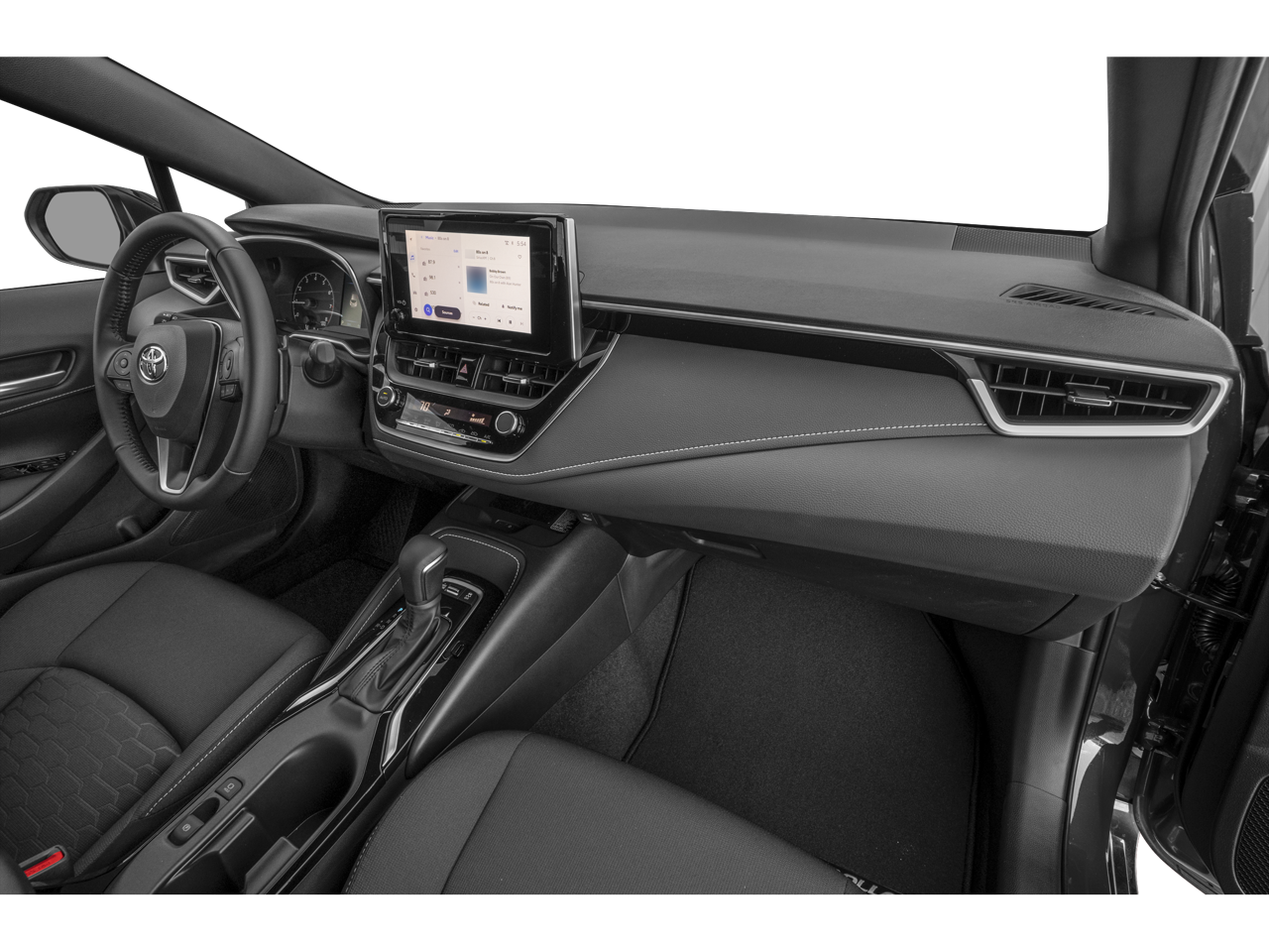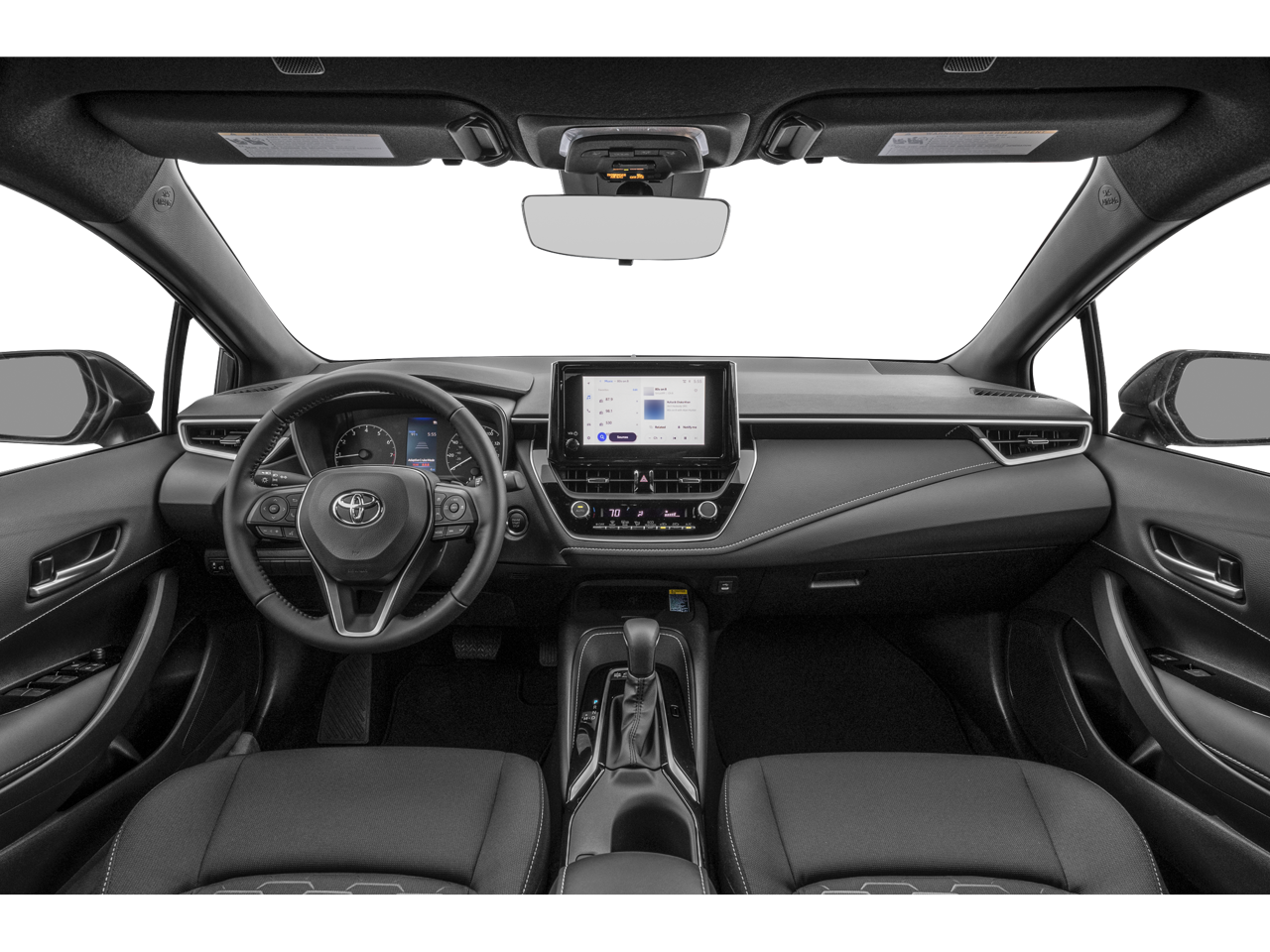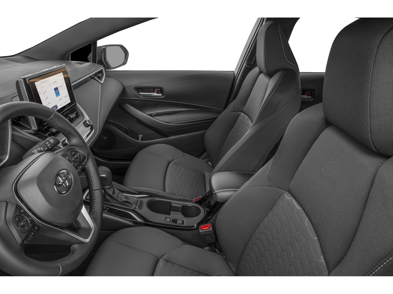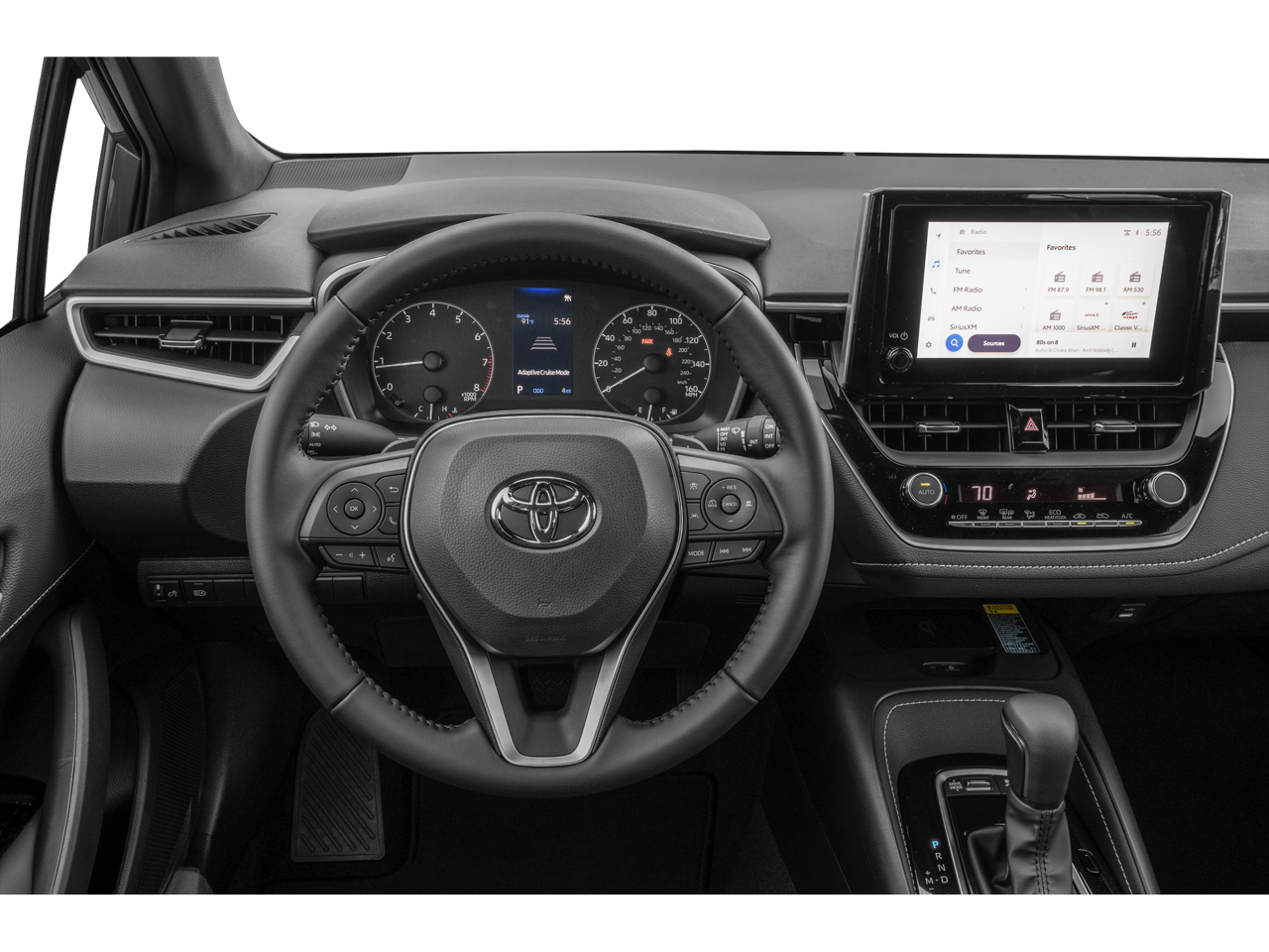 Equipped with 16 Alloy Wheels, 4-Wheel Disc Brakes, 6 Speakers, ABS brakes, Air Conditioning, Alloy wheels, AM/FM radio: SiriusXM, Auto High-beam Headlights, Automatic temperature control, Brake assist, Bumpers: body-color, Compass, Delay-off headlights, Driver door bin, Driver vanity mirror, Dual front impact airbags, Dual front side impact airbags, Electronic Stability Control, Emergency communication system: Safety Connect (up to 10-year trial subscription), Exterior Parking Camera Rear, Fabric Seat Trim, Four wheel independent suspension, Front anti-roll bar, Front Bucket Seats, Front Center Armrest, Front reading lights, Heated door mirrors, Illuminated entry, Knee airbag, Leather Shift Knob, Leather steering wheel, Low tire pressure warning, Occupant sensing airbag, Outside temperature display, Overhead airbag, Overhead console, Panic alarm, Passenger door bin, Passenger vanity mirror, Power door mirrors, Power steering, Power windows, Radio data system, Radio: 8 Toyota Audio Multimedia, Rear anti-roll bar, Rear seat center armrest, Rear side impact airbag, Rear window defroster, Rear window wiper, Remote keyless entry, Security system, Speed control, Speed-sensing steering, Split folding rear seat, Spoiler, Sport Front Seats, Steering wheel mounted audio controls, Tachometer, Telescoping steering wheel, Tilt steering wheel, Traction control, Trip computer, Turn signal indicator mirrors, and Variably intermittent wipers.